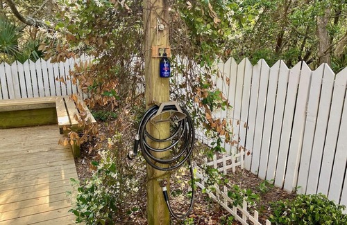walk through the gated and recently expanded fenced area near the front door and you'll see an outdoor shower and wash station to help keep the sand out of the house We even include dog shampoo if you need to give your 4-legged friend a bath.