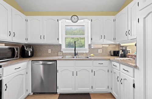 The Beale Treasure Basecamp boasts 3 inviting bedrooms, including 2 king beds and 1 full bed. With amenities like a well-equipped kitchen with all new appliances, new washer/dryer, 4 all new smart tv's, top deck off dining room with table, umbrella, new gas grill and chairs to enjoy dinner outside while watching the deer and turkey roam in the large backyard, and a 1st floor screened in porch with comfortable couch, guests will feel right at home. The master bathroom has a shower, and the 2nd bathroom offers a bathtub, we have basic bath essentials (hand soap, body wash, shampoo, and conditioner), and a hair dryer for added convenience. We are perfect for traveling nurses/doctors, professionals, families looking for outdoor adventures (you never can tell, you may be the lucky one to find the Beale Treasure in the nearby mountains!), couples looking for a peaceful getaway, parents traveling to visit their Liberty or Lynchburg University students, attending weddings, graduations, and for family gatherings. Guests will have access via keyless entry. We know you will enjoy your stay at our cozy and comfortable home with the perfect mix of privacy, functionality, and location!.