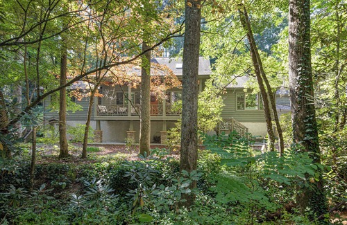 escape with family and friends at this beautiful, newly furnished home on a unique & special setting in the nc mountains with a stream, bridges, and plenty of porch & deck space Feel secluded among beautiful trees and gardens just minutes to downtown Hendersonville & Flat Rock & a stones throw from amazing hiking, biking, golf, & other towns. Fully conditioned garage includes game room & office space.