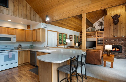 as you step inside you walk into the living room that features a beautiful wood burning fireplace with provided wood, vaulted ceilings and large picture windows framing the beauty right outside Also on the main level there are two additional bedrooms, a bathroom and access to the main deck. Head upstairs to the loft bedroom where you will find two Double beds and a perfect hang out area for the kids after a long day of lake adventures.