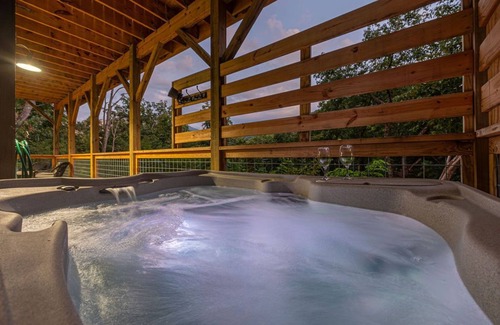 along with the great location, a bear's gatlinburg splash gives you a taste of luxury on the lower level of the cabin with outdoor seating with a picnic table, cushioned chairs, a hot tub, a charcoal grill, and best of all you can enjoy a private, heated, salt pool all year round