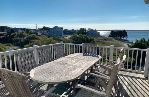 home boasts picturesque waterfront setting with beautiful views of nantucket sound & abutting circo pond Enjoy fabulous decks to soak in gorgeous active views as you watch waves, sailboats, ferries, windsurfers & amazing airborne jumps of kiteboarders. Bird watchers will take pleasure in hearing lovely songs of red winged blackbirds, and spotting great blue herons, egrets, mute Swans, geese, ducks, cormorants, sandpipers, & osprey. Large open floor plan, open kitchen, and comfortable furniture. Spectacular views from nearly every room. This elegant home will provide a seaside dream vacation and wonderful memories.