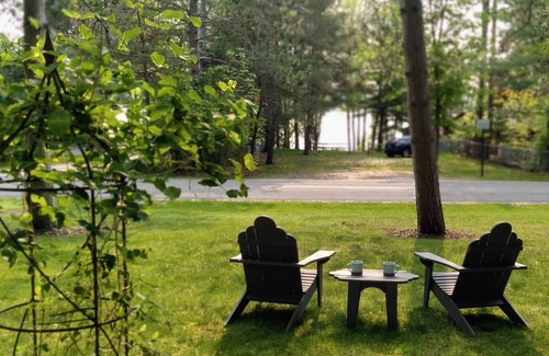 "Four Pines Cottage" is a 2 bedroom, 1 bathroom cottage with a lakeview setting of Lake Bellaire. There is seating on the front porch to enjoy the sunrise and lakeview. It is across from a public access which has a hard sandy bottom for swimming, paddleboarding and kayaking. The backyard has a fire ring with a swing to enjoy the tranquil wooded atmosphere. A public beach is a five minute walk away for your Stay and Play retreat!.