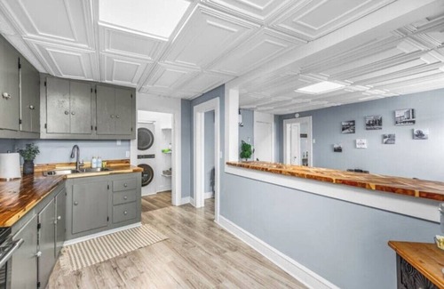 enjoy a fully stocked kitchen with butcher block countertops, bar seating, stainless appliances, and all the essentials for home-cooked meals The large bedroom offers a plush king bed and ample storage, while the bright bathroom includes fresh linens and modern finishes. With keyless entry, high-speed Wi-Fi, and in-unit laundry, everything you need is here.