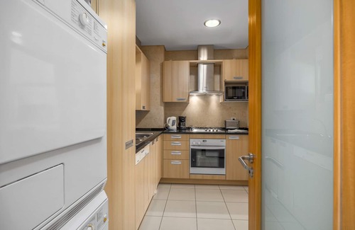 the apartment is fully equipped with a modern kitchen which includes oven, stove, microwave, fridge, pots and pans, wine glasses, coffee machine, kettle, dishwasher, washing machine, dryer, iron and board, etc The bedroom has a large wardrobe for neatly storing all clothing items. A flat-screen TV in the living room is set up with IPTV, giving access to channels and broadcasts from all over the world, and stylish and comfortable indoor and outdoor dining furniture make for a relaxing experience when supping in situ.