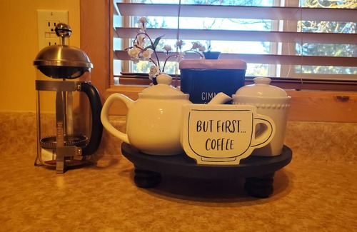 a keurig coffee maker is provided with a wide selection of coffee and hot cocoa pods, along with a french press for a richer brew You’ll also find a teapot with a variety of tea bags, raw sugar packets, and coffee creamer for the perfect cup.