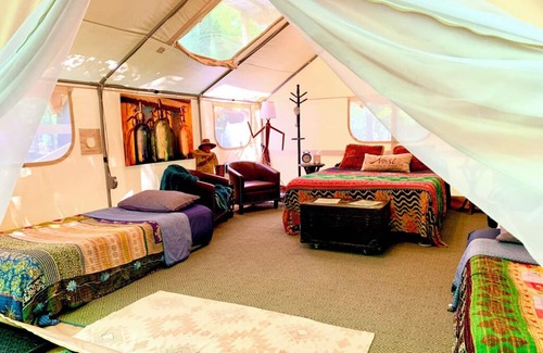 to end your magical night, retire over to the oversized 14'x16' safari style tent It is a comfy and spacious eclectically designed retreat. Boasting a gel memory foam mattress on a queen size bed with lush sheets and down alternative comforter to ensure everyone's comfort. Enjoy the seating area with a good book as the afternoon sun shines through.