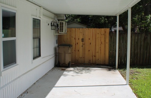 guests park under the carport and enter their space through the private backyard door