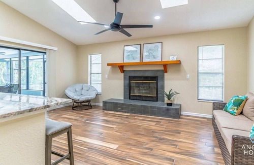 - direct access from the living room to the covered lanai with an outdoor dining table and ceiling fan it’s all screened in to keep pests out so you can dine comfortably and keep an eye on the action in the pool!