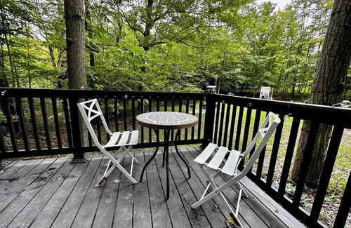 unwind on the outdoor deck, surrounded by tall trees and the soothing sounds of nature It's the ideal spot to enjoy your morning coffee or relax with a good book. As the sun sets, gather around the fire pit for s'mores and storytelling under the starlit sky - a truly magical experience.