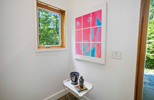 the mod lodge, a stunning mountain retreat, was crowned the winner of the matsumoto prize—north carolina's most prestigious accolade dedicated solely to modernist residential architecture in 2010 This custom-built home blends contemporary design with the rustic charm of its natural surroundings. As you step into the main level, soaring ceilings that create an airy, open atmosphere greet you, perfect for basking in the serenity of the mountains. The spacious, relaxing living area features a leather sectional to sink into after a day of adventure. A large HDTV promises entertainment, but it's the warmth of the wood stove that truly steals the show. Imagine cozying up by its gentle glow on a crisp winter evening, the flickering flames casting a soft, golden light that enhances the room's inviting ambiance. The Mod Lodge features a modern kitchen with sleek stainless steel appliances and a butcher block island, adding a touch of rustic warmth. The island has seating for two, making it an ideal spot for casual meals or a quick chat while cooking, and a dedicated workspace gives you space for productivity.