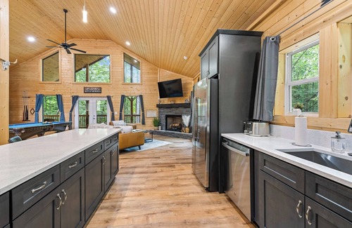 Looking for an upscale, spa-like retreat in the heart of nature? Discover your perfect getaway with our stunning barndominium-style cabin nestled in the woods.
