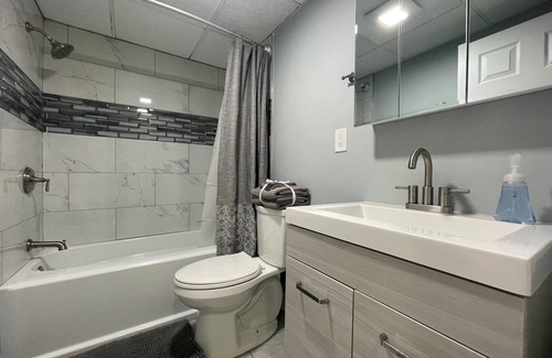 This new construction has an open layout with a welcoming living room, 2 bedrooms, and an eat-in kitchen complete with black stainless steel appliances, quartz countertops, recessed lighting, and under-lit cabinets. The bathroom has a tiled floor, glass shower, new faucets, fixtures, and a pedestal sink. The unit is equipped with high-speed internet, a smart TV, central heating, an entrance deck, and private parking. Perfect for UMass Medical, Bio-tech, and local stays!.