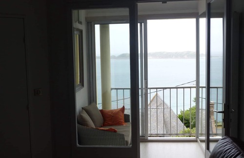 Apartment for 4 people located in the second (and last) floor of a small residence very quiet, with a private parking, located close to the city center and 500m from the beach of Trestrignel, where you can enjoy the joys Of swimming even at low tide. The apartment consists of a bedroom with a double bed and a flat screen TV (117 cm) with a nice sea view on the 7 islands, a fully equipped kitchen (microwave / grill, SENSEO coffee machine, Fridge / freezer, toaster, kitchen utensils, crockery, cutlery, ....) open on a living room and a living room with a table for 4 people and a sofa, the whole, overlooking A loggia equipped with a sofa in braided resin so as to be able to contemplate the exceptional panorama that offers this apartment of 42 m². The mezzanine consists of 2 bunk beds, as well as a fully equipped bathroom (washing machine / dryer, bathtub with glass wall). The toilet is separated from the bathroom. The apartment offers beautiful amenities with quality fittings, all decorated with taste, on a new floating floor. You can have a common room at the condo to put your holiday business (surfboard, bicycles, wetsuits, ....).