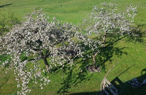 we have a beautiful sun terrace in front of the house with a view of the valley, a garden with fruit trees, meadows, a fountain and streams around the house