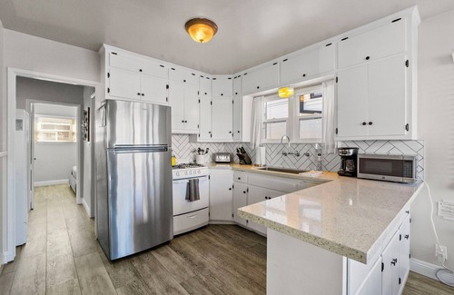 this beautiful cottage with a white picket fence gate, wonderful patios with ample seating and gas bbq's for you and your family to enjoy Both units have an open concept living space, with a dining area, a family room to the that includes a flat screen Smart TV, and the entire home has Wi-Fi. A galley-style kitchen includes a refrigerator, dishwasher, microwave, gas range, a traditional coffee maker, as well as a Keurig and everything you will need for cooking. The ground floor home also has a laundry room with a full-sized washer and dryer, iron, and ironing board.