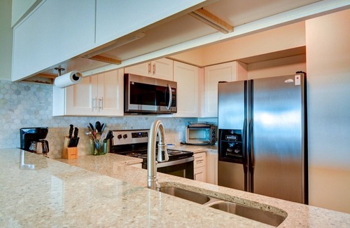 continuing into the unit brings you into the kitchen and the dining area just beyond The living room is located on the oceanside where you have access to the oceanfront deck and beautiful views while you relax on the comfortable furniture.