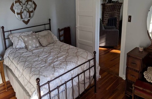 the farmhouse has 2 bedrooms & 1 bathroom with a tub/shower combination The kitchen is fully equipped with dishwasher, microwave, & Keurig coffee maker. There is a separate dining room that seats 6, a living room, & den with TV. We have a small screened porch & back deck, fire pit, & charcoal grill. the farm has outdoor string lights, sitting areas, picnic tables, fishing rods, kayaks & cornhole!