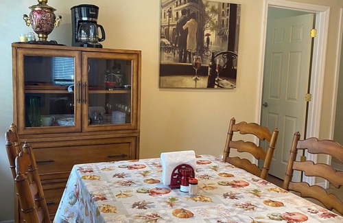this two bedroom apartment has a large fancy bathroom with a shower and large tub Unit is equipped with a fully functional and equipped kitchen with dishwasher and microwave. There are two twin size beds, which can be put together. There is a dresser and closet in which guests can store their belongings. There is also Xfinity Wifi and cable to accommodate guests with all their entertainment needs. Large smart TV, which has Netflix, Amazon Prime and general channels.