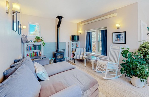 inside, you'll be struck by the beautiful natural light streaming in through the windows Enjoy a sleek kitchen with stainless steel appliances and streamlined cabinetry, a bistro dining table where you can have breakfast in the sunshine, and a living room with a smart TV and a cozy fireplace. The two bedrooms are upstairs, with one offering a smart TV and the other providing a desk workspace where you can log onto the free WiFi.