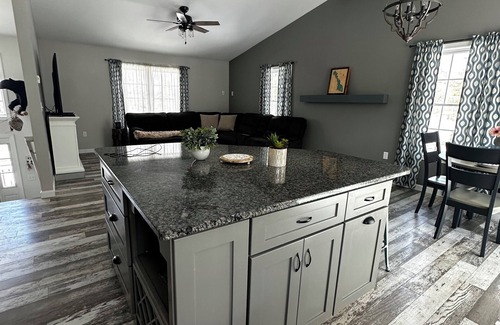 nestled on a 175-acre wooded lot, this spacious 2,000 sq. ft. home offers 4 bedrooms and 2.5 baths. The primary bedroom features a king bed, a walk-in closet and full bath. The second bedroom has a full-size bed, the third a twin bed, and the finished basement offers a fourth bedroom with a full-size bed, queen sofa, desk, half bath, and laundry. Enjoy outdoor relaxation by the fire pit, and make use of the fully equipped kitchen.