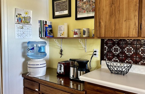 This 1960s ranch home in a quiet West side neighborhood in the foothills of the Tucson Mountains has recently been remodeled with an eye to comfort and water-consciousness and is featured in the Watershed Management Group 2025 Desert Living Home Tour as an example of sustainable desert living. The private pollinator-friendly organic garden in the backyard is sustained by harvested rainwater and visited regularly by hummingbirds, finches, butterflies, native bees, and quail. Over the past several years we have been working on habitat restoration in the previously gravel yard. Every year we add more rain basins and more native-critter-friendly plants! You are quite likely to see our local javelina herd ambling by in the front or along the fenced easement behind the house, and you may fall asleep to a coyote concert. When you sit on the back patio looking over the spacious yard, you'll be able to take in the Catalina mountains, mature mesquite and palo verde trees, magnificent clouds or storms depending on the season, and the occasional hawk or vulture. At night, the moon and stars are radiant and the nighthawks dart through the yard.