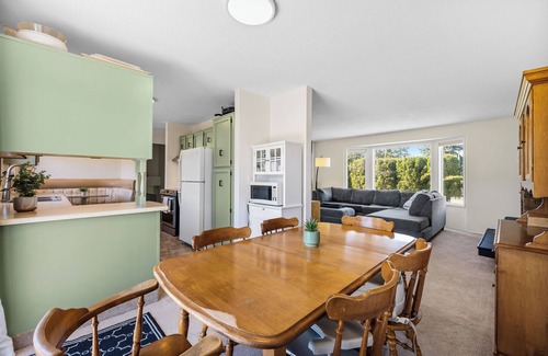 our 3 bedroom 25 bathroom home sleeps up to 5 adults. Bedrooms feature one king bed, one queen bed, and a bunk bed with a single up and full down, as well as a blow-up toddler bed and pack 'n play upon request. All bedrooms are on the upper floor along with 1 full and 1 half bath. Downstairs features a living/office/entertainment room and the second full bathroom. We are lovingly renovating so there is a charming mixture of vintage and updated. Our 1/4 acre flat backyard is fully fenced, with a beautiful mature cherry tree and items for the kids (trampoline, swing, and climbing tower - please note we require a waiver to be signed for kids to use these). Walkable distance to Soma Craft Cidery, and easy 5 min drive to several wineries. We are 2 min away from Myra Bellevue Provincial Park if you enjoy hiking or mountain biking. 10 minutes to the first beaches and 15 minutes to downtown.