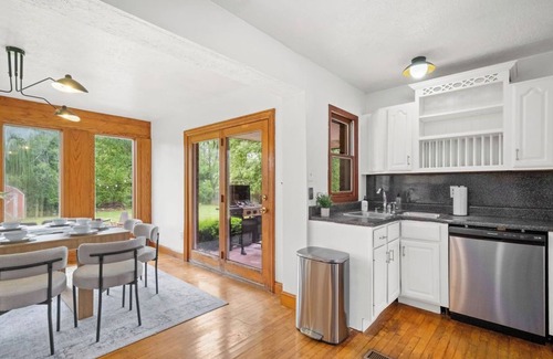 cook up a feast in a kitchen equipped with all the essentials The adjacent dining area has space for gathering and sharing meals.
