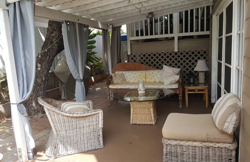 we offer a separate, private bedroom and bath, with it's own kitchenette, washer/dryer, front and side sitting areas The unit has it's own parking in front, with it's own private entry. Rental includes window a/c, fan, 40" tv with cable, internet, keyless entry and a closet full of sundries and beach gear. There is a backyard sunning area and b-b-q.