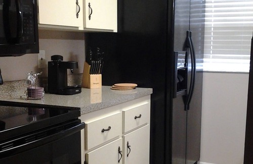 Our villa is one of four(4) units where the lanai backs right onto a patio that leads to the large swimming pool in the villa community. This spacious, private and quiet one-story villa accommodates up to two people. This villa 1 bedroom 1 bath and half bathroom it comes fully furnished with washer and dryer inside the unit. Parking in front of the unit...relax at the terrace looking at the trees of the patio.