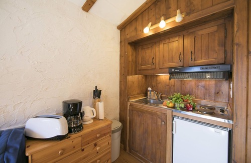 couples can kick back in the 2nd floor apartment, which features an inviting open plan sitting room with a tv, small kitchenette and a dining area The light and bright living space provides access to a private balcony furnished with a Mont Blanc-view dining area.