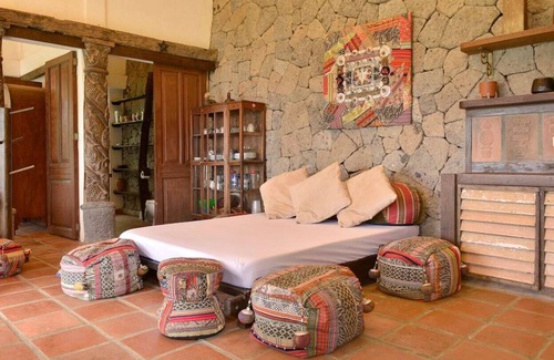 the bedroom has one double bed good for two guests In the living area, we have one sofa bed that can also sleep two plus one queen-size bed which we also use as a lounge bed with poofs and pillows.
