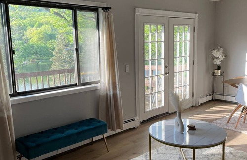 Welcome to our beautiful newly renovated home on the lake. The house consists of 3 bedrooms, 1.5 baths, and an open floor concept. When you arrive there will be a 3 car driveway. A walkway to the entrance with 3 steps. Once you open the doors to your home, you are greeted by the coffee bar seating area with a beautiful view to the front of the home! The kitchen is new with white cabinets and butcher block countertop. You then walk into the open floor dining room living room area with a sofa sleeper, smart TV, and French doors to a big deck!!! Here, you have full views of the lake. Have a seat and enjoy the views while you have lunch or grill. unfortunately there's no access to the lake or club house amenities.