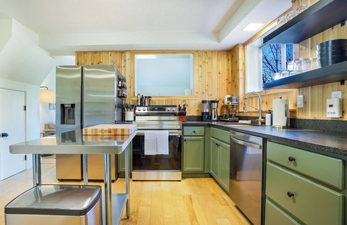 the kitchen is fully stocked with a refrigerator, electric stove, plenty of pots, pans, and cooking utensils, dishwasher, microwave, oxo drip coffee maker, blender, mixer, electric kettle, toaster, wine glasses, and a cocktail kit