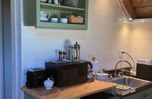 in addition to the main house, shed peaks offers a peaceful, detached bedroom just 50 feet from the home near the garden This cozy hideaway has a queen bed, electricity, a small entry porch, and a deck. While it has no bathroom or running water, the breezes and privacy make it a favorite for guests who enjoy a quiet escape.