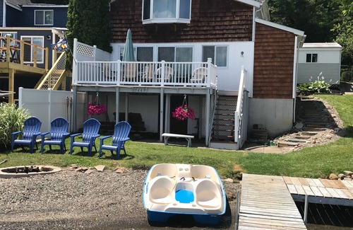 outside enjoy the sunrise with a cup of coffee on the waterfront deck Watch the kids swim or fish of off of the dock. There is a grassy area in front to play catch, corn hole, or other games. For meals use the grill at the side yard sitting area. Want to read a book? Use the sitting area off of the dock to relax. Grab a beverage from the refrigerator located in the 'basement' at lake level. At night use the lakeside firepit to cook s'mores and enjoy the tranquil sound of the waves on the shore.
