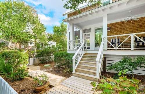 2 homes, 2 kitchens, 2 crofters, 2 outdoor showers, 2 outdoor grills, 3 sets of washer/dryers and 3 golf carts all provide the opportunity to bring your extended family, large groups, or two families together while still allowing everyone to have their own space Step through any of the six picket fence gates and be transformed as you take in the beauty of this charming property all brought together by boardwalks linking intimate outdoor spaces.