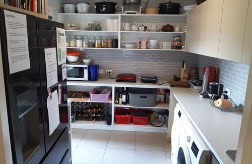 our house offers a large inviting open plan living area and sitting room which comfortably seats 10 -12 people on new leather reclining lounge furniture A modern kitchen and large butlers panty stocked with all of the necessary kitchen appliances completes a contemporary cooking environment that satisfies any sized dinner party plan.