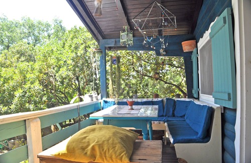 Semi-detached house, called 'The Cottage', surrounded by greenery, with private garden equipped with hammock, beach loungers, outdoor table, barbecue.