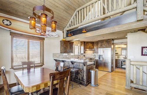 This beautiful cabin retreat is newly finished and furnished for you and your family to enjoy the beauty and serenity of the Kamas Valley. Views from every room and some of the best sun sets Utah has to offer! Mount Timpanogos, Deer Valley, Park City Mountain and the Canyons Village can all be seen from the living room and covered balcony. This main level master unit is suited with a Queen bed and a full bathroom with a large shower with dual shower heads and a rain shower. Full size shared laundry. Kitchen is fully stocked with all the dinnerware, pots, pans and spices you'll need. A Traeger is also available in the summer time on the covered porch. The dining room sits 6 with 3 more seats at the bar. The living room is complete with a beautiful stone floor to ceiling fireplace with a large TV for movie nights cuddled up. The loft has a separate TV, oversized bean bags, games and two custom bunks with full sized sleeping spaces. Living room couch is a pull out for even more sleeping room. Road to the cabin is a gravel road so during the winter you must drive a 4x4 or AWD vehicle with good snow tires.