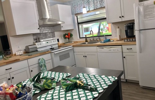 • a fully equipped kitchen with a full size stove, oven, microwave, keurig coffee maker, drip coffee maker, blender, juicer, toaster, 15 quart crock pot, 3 quart crock pot, coffee grinder, waffle maker, milk shake maker, and full size refrigerator w/ice maker plus all necessary cookware, dishes, utensils, and flatware