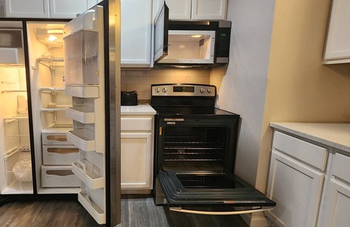 Location, location, location!! Located in the heart of Orange, Texas in good neighborhood less than 3 minutes to various dining and shopping. Walmart, Tia Juanita's, Whataburger etc... Two gyms within 5 minutes including a Planet Fitness. Kroger, HEB grocery. Various Refineries and Chemical plants including the Chevron 4-year expansion project are also 5 minutes. There is a nice neighborhood playground in walking distance. 4 car parking in driveway. Front door custom keyless keypad entry. There are 2 master bedrooms at this 4-bedroom 3 full bath property with miniblinds in all bedrooms. 55" smart TV with WIFI for streaming and internet access. Large full leather sectional couch 8+ adult seating. There is a beautiful, featured rock wall fireplace that is for decorative purposes only. All stainless-steel appliances Refrigerator, Microwave, and Dishwasher with detergent, dish soap with dishrags. Beautiful Quartz kitchen counter tops. Washer and Dryer with wash pods, Coffee maker, POD coffee as well, toaster, Dinner ware, cook ware, cooking utensils, cutlery, silverware. All bathrooms are supplied with shampoo, conditioner and body wash dispensers mounted in each shower. All body towels and wash clothes supplied and bath tissue. All beds have 2 sets of bedding sheets. Large concrete back porch. *** Note: No smoking indoors and no pets indoors. **the fireplace is out of order**