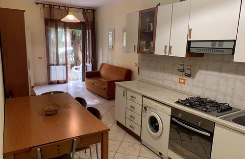 ideally located just 90 meters from viale dei pini and 550 meters from the beach, this comfortable apartment is very close to the town center The recently renovated property features a spacious living room with a kitchen area, sofa, TV, and washing machine. It offers two bedrooms: one with a double bed, a single bed, and two wardrobes; the other with two single beds (which can be joined) and an additional wardrobe. The bathroom is fully equipped with a shower box and is spacious enough to be comfortable. Outside, there is a shared courtyard area where you can enjoy meals with a table and chairs. At the back of the building, you’ll find a reserved covered parking space with a canopy. The property also includes a small shared garden and a designated area for bicycle parking.