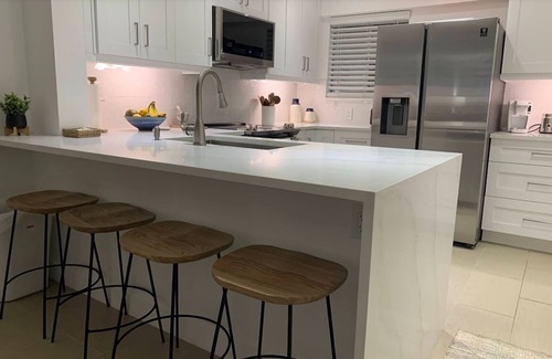 the kitchen has been fully renovated with all new appliances and is completely equipped (glasses, silverware, coffee maker, bottle openers, too much to list) There is a separate laundry room with a full-size front load washer and dryer. There is a complete entertainment system in the living room which includes a 55” flat-screen TV, digital cable, DVD and soundbar. High-Speed Internet access is included. THIS APARTMENT IS NOT A BARE BONES RENTAL. It is decorated with a modern clean coastal touch and equipped for everyday comfort and convenience.