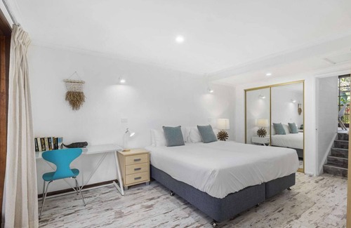 the self-contained studio on the ground floor opens out onto the bbq area by the pool and has a queen bed, dining/ seating area, kitchenette, private bathroom and laundry facilities