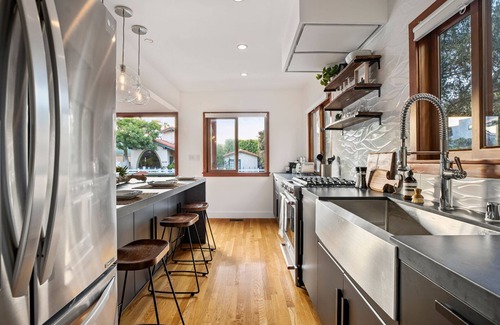 the house is complete with chefs kitchen- top of the line appliances including kitchen aid stove, miele dishwasher, and lg refrigerator Kitchen is equipped with everything you'll need for your stay. Cozy furnishing throughout. In-door/outdoor vibe with outdoor dinning area and fire-pit overlooking the canals. Private and detached office space separate from the main house..