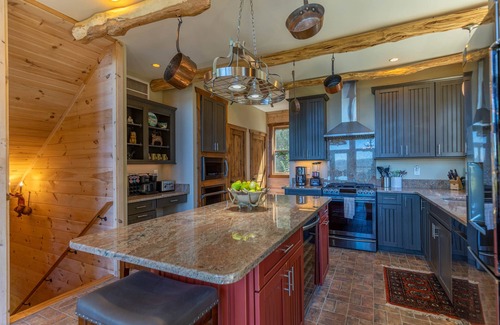 on the main level you'll find an open great room with exposed bark log beams, vaulted ceilings, a stone gas log fireplace, circular couch, big hdtv, a wall of windows overlooking the layered mountain views, and access to the deck There's a gorgeous kitchen with wine cooler, island, granite counters, and stainless appliances including double ovens, double microwaves, and a gas range ready for entertaining. Seating for everyone is available with the dining table and four bar-height seats at the counter. Off the kitchen, you'll find a main level half-bath. On the other side of the Great Room, you'll find the King Master Suite, featuring a beautifully tiled walk-in shower, direct access to the deck, a large closet, and a private flat screen TV.