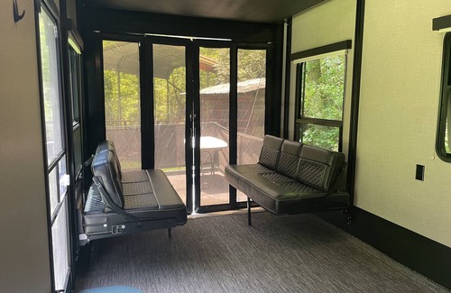 our rv can accommodate up to 6 guests and is great for families & children The master bedroom has one queen bed and the second bedroom has a queen over queen bunk set up. The main living area has a 4-seat reclining leather couch.