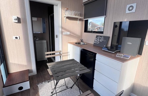 a cozy 139-square-foot tiny home overlooking a unesco wetlands reserve, adjacent to our biodynamic farm Complete with easy access to water, split air conditioning, a kitchenette, cooking equipment, and excellent bathroom facilities. These amenities include an eco-friendly cassette toilet with a removable waste holding tank, hand basin, and gas-heated shower.