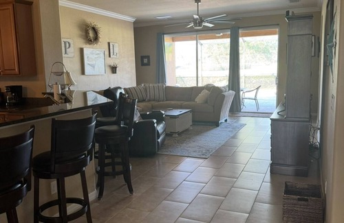 curl up and relax in the cozy living room on the large sectional sofa or comfy recliner while watching tv or reading a book from our fully stocked bookshelf Just off the living room through the sliding door is a covered lanai with more seating and a heated pool. You can enjoy the beautiful weather while dining al fresco or soak up the sun in a lounge chair.